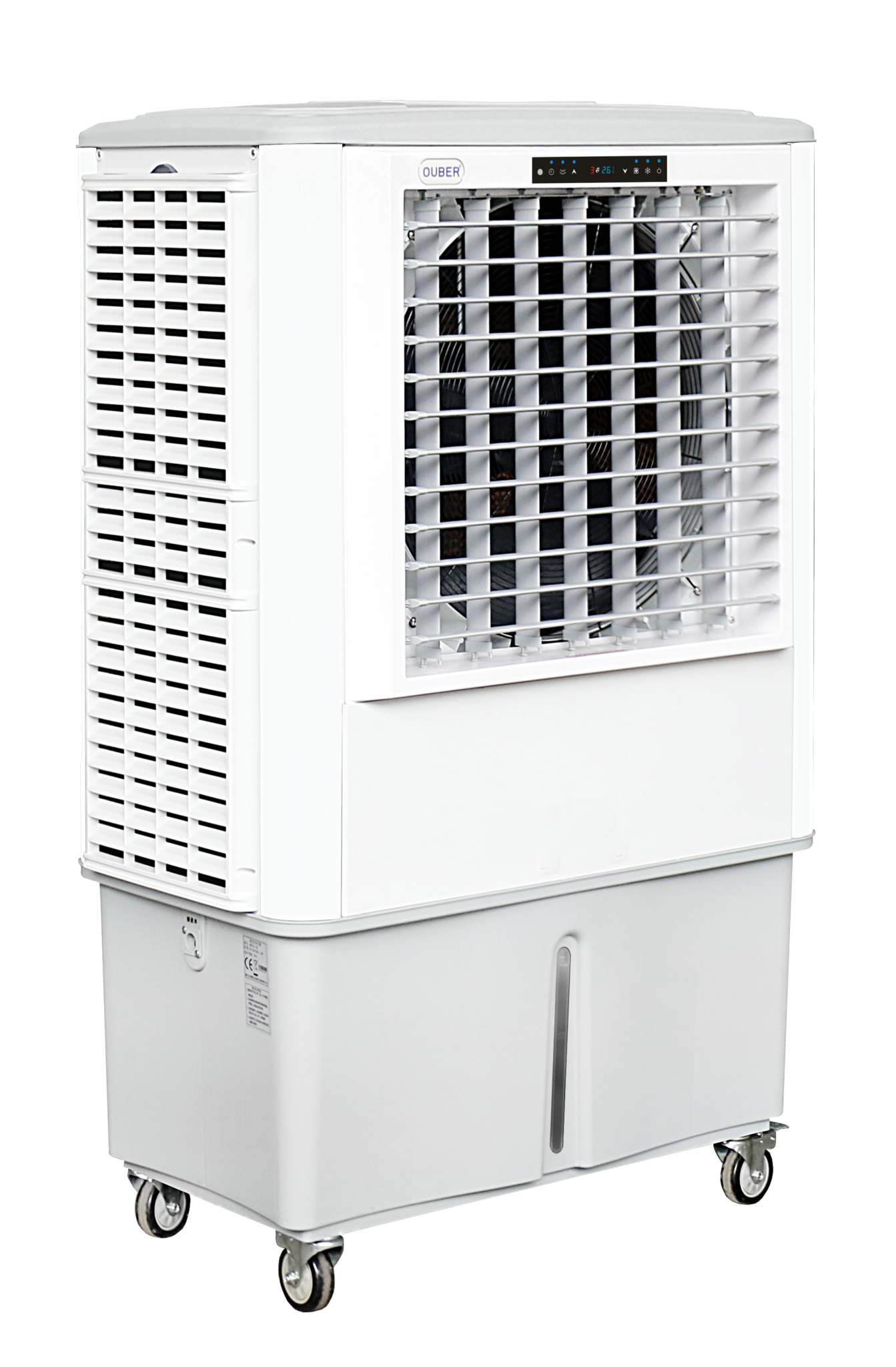 The OUBER PAC1100-A Evaporative Air Cooler offers 50 adjustable speeds, a digital touch panel for precise control, and a substantial 175L water tank for extended cooling. It is powered by a high-quality, silent fan and a pure copper motor and delivers strong, energy-efficient airflow. The device features a durable, 100% new PP shell, an odour-free cooling pad, and a water-drop wind bar for optimal cooling performance. Additional features include a 5-metre cable winding storage, a 10-metre remote control, a 1-8 hour delayed shutdown timer, quick pipe connect, a wide adjustable range, a dust-proof filter, swivel casters with brakes, and stainless-steel screws. An optional UV germicidal lamp and circulating water pump can be added to the PAC1100-A Evaporative Air Cooler for enhanced air quality.